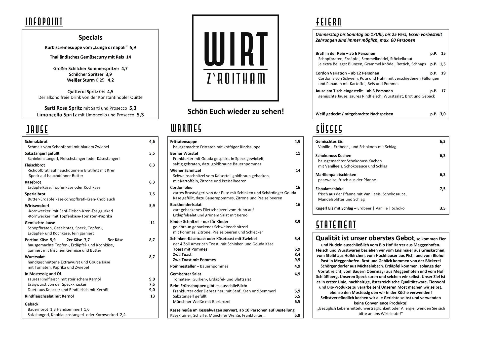 so kommen Eier und Nudeln ausschließlich vom Bio Hof Harrer aus Meggenhofen. Fleisch und Wurstwaren beziehen wir von der Metzgerei Englmaier aus Grieskirchen, vom Steibl aus Hofkirchen, vom Biohof Past in Meggenhofen und von der Landmetzgerei Hochhauser. Brot und Gebäck kommen von der Bäckerei Schörgendorfer aus Michaelnbach. Erdäpfel kommen, solange der Vorrat reicht, vom Bauern Obermayr aus Meggenhofen und vom Hof Schlüßlberg. Unseren Speck suren und selchen wir selbst. Unser Ziel ist es in erster Linie, nachhaltige, österreichische Qualitätsware und Bio-Produkte zu verarbeiten! Unseren Most machen wir selbst, ebenso den Mostessig den wir in der Küche verwenden! Selbstverständlich kochen wir alle Gerichte selbst und verwenden keine Convenience Produkte!